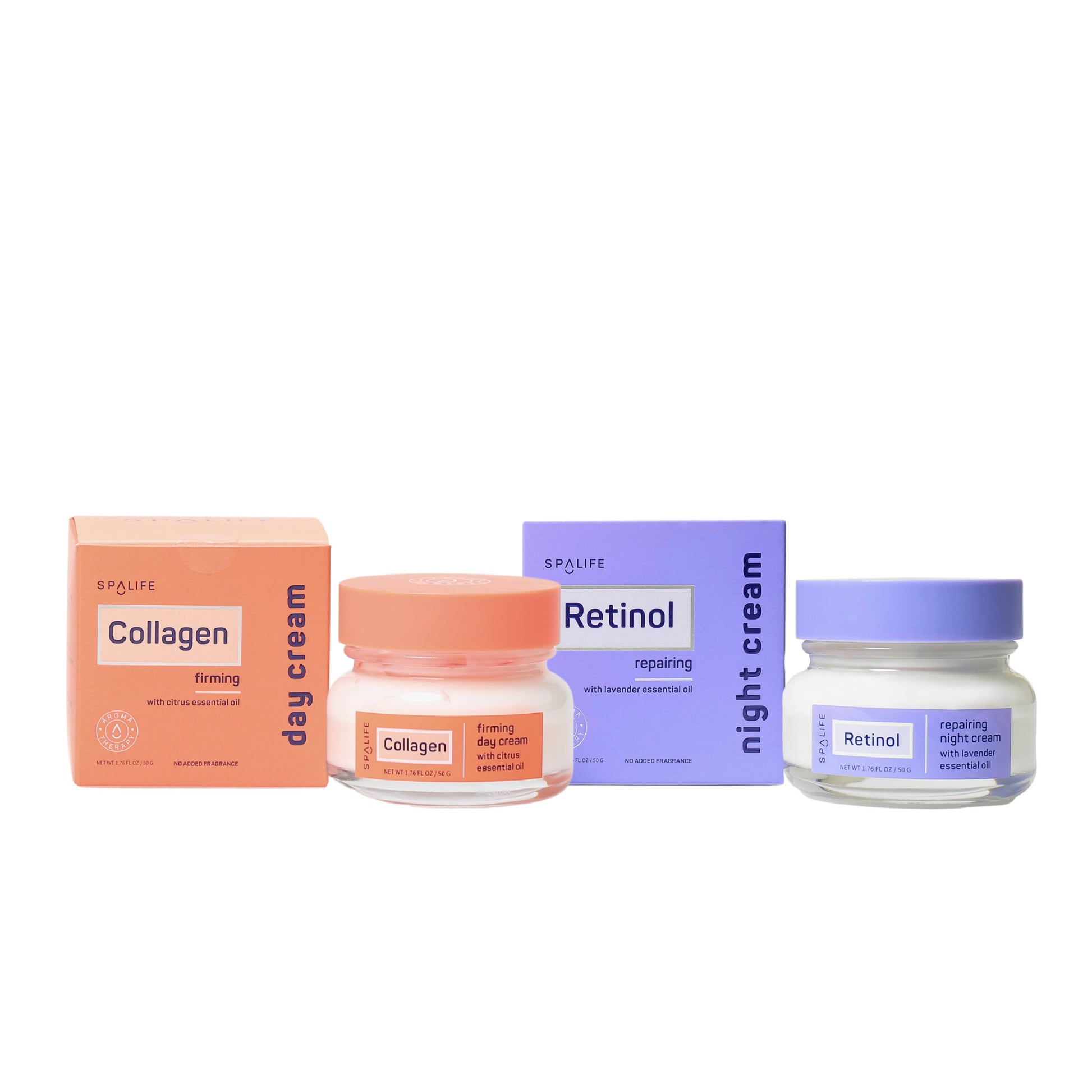 Collagen-infused day cream plumps the look of skin, while retinol-powered night cream targets texture & lines.